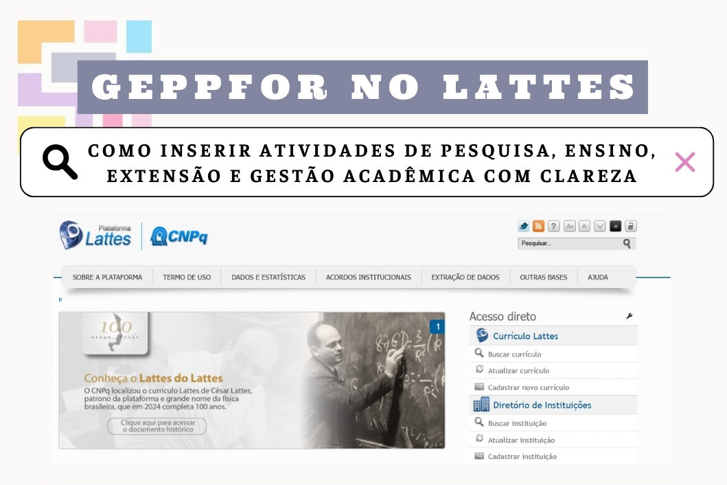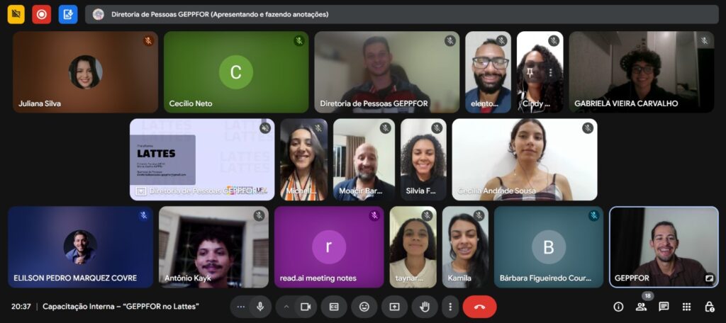 No dia 16 de maio de 2025, às 19h30, a Diretoria de Pessoas realizou a capacitação “GEPPFOR no Lattes: Como inserir atividades de Pesquisa, Ensino, Extensão e Gestão Acadêmica com clareza“. Ministrada por Eduardo de Oliveira Saraiva e Marco Túlio da Cunha Silva Moreira, o evento teve como objetivo capacitar os(as/es) membros(as/es) do GEPPFOR-UFV na correta inserção das atividades do grupo em seus currículos Lattes, promovendo mais autonomia e eficiência na atualização de informações e na valorização das ações do grupo.
