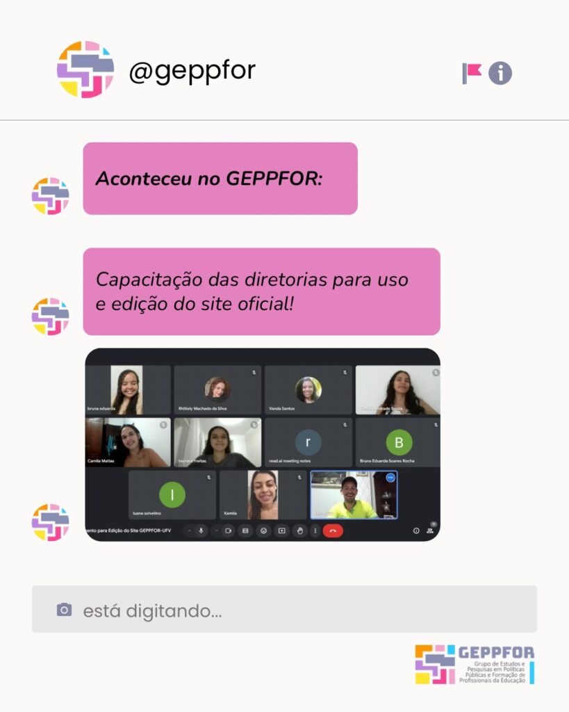 No dia 26 de março de 2025, foi realizado pela Diretoria de Pessoas o treinamento para edição do site GEPPFOR-UFV, com o objetivo de capacitar os membros representantes das linhas e diretorias do grupo na edição e manutenção do site, com o intuito de garantir maior autonomia e eficiência na atualização de conteúdos e divulgação das atividades do grupo de pesquisa.