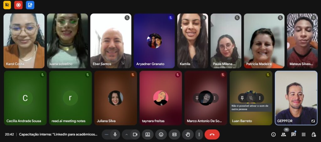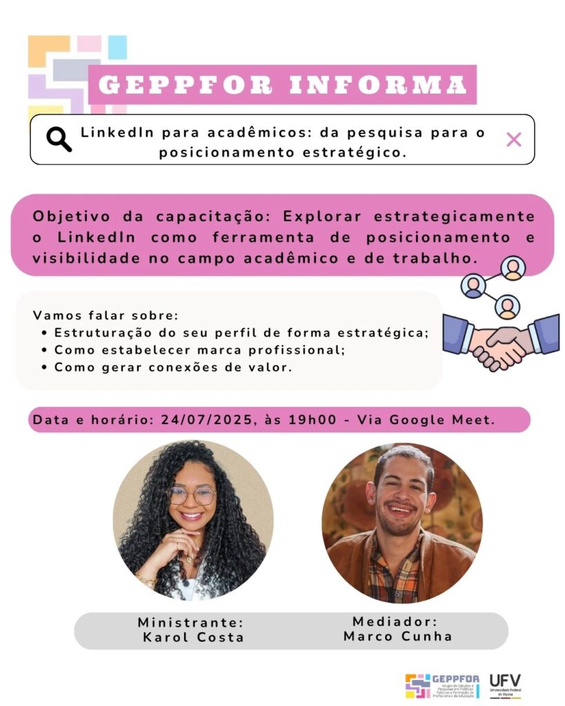 A atividade teve como objetivo orientar os(as/es) membros(as/es) do GEPPFOR-UFV sobre o uso estratégico do LinkedIn como ferramenta de visibilidade acadêmica e profissional. Durante a capacitação, os participantes puderam conhecer melhor as funcionalidades da plataforma, esclarecer dúvidas e refletir sobre formas eficazes de manter seus perfis atualizados, alinhando-os às suas trajetórias na pesquisa e no mercado de trabalho.